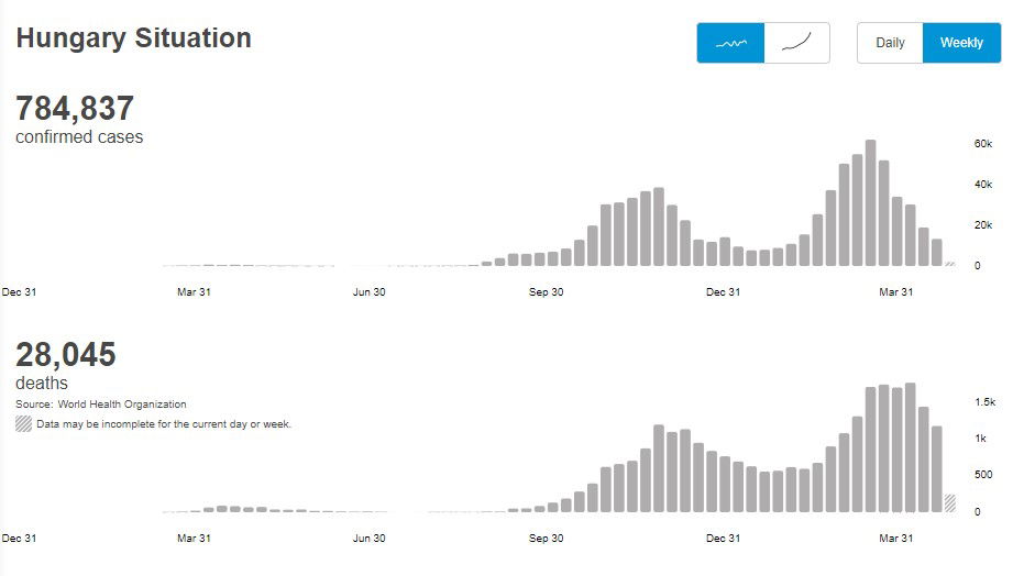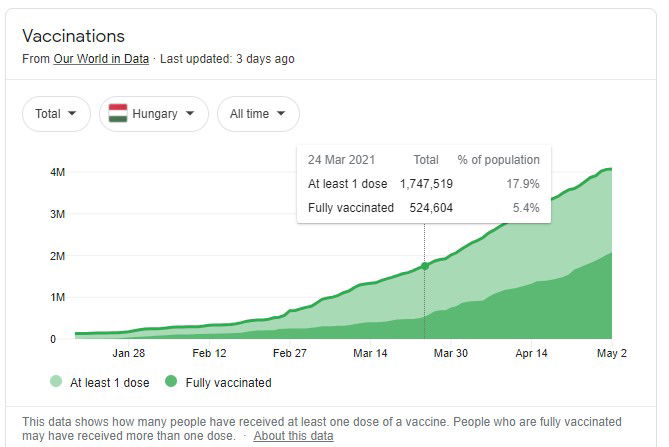 In quel momento solo per poco più di mezzo milione di ungheresi era stato completato il ciclo vaccinale, se guardate la curva qui sopra vedete che il numero dei vaccinati da fine marzo a fine aprile è aumentato moltissimo, mentre la curva dei contagi ha preso a scendere. Sostenere che i vaccini in Ungheria hanno causato il picco è, in maniera piuttosto evidente, mentire.
