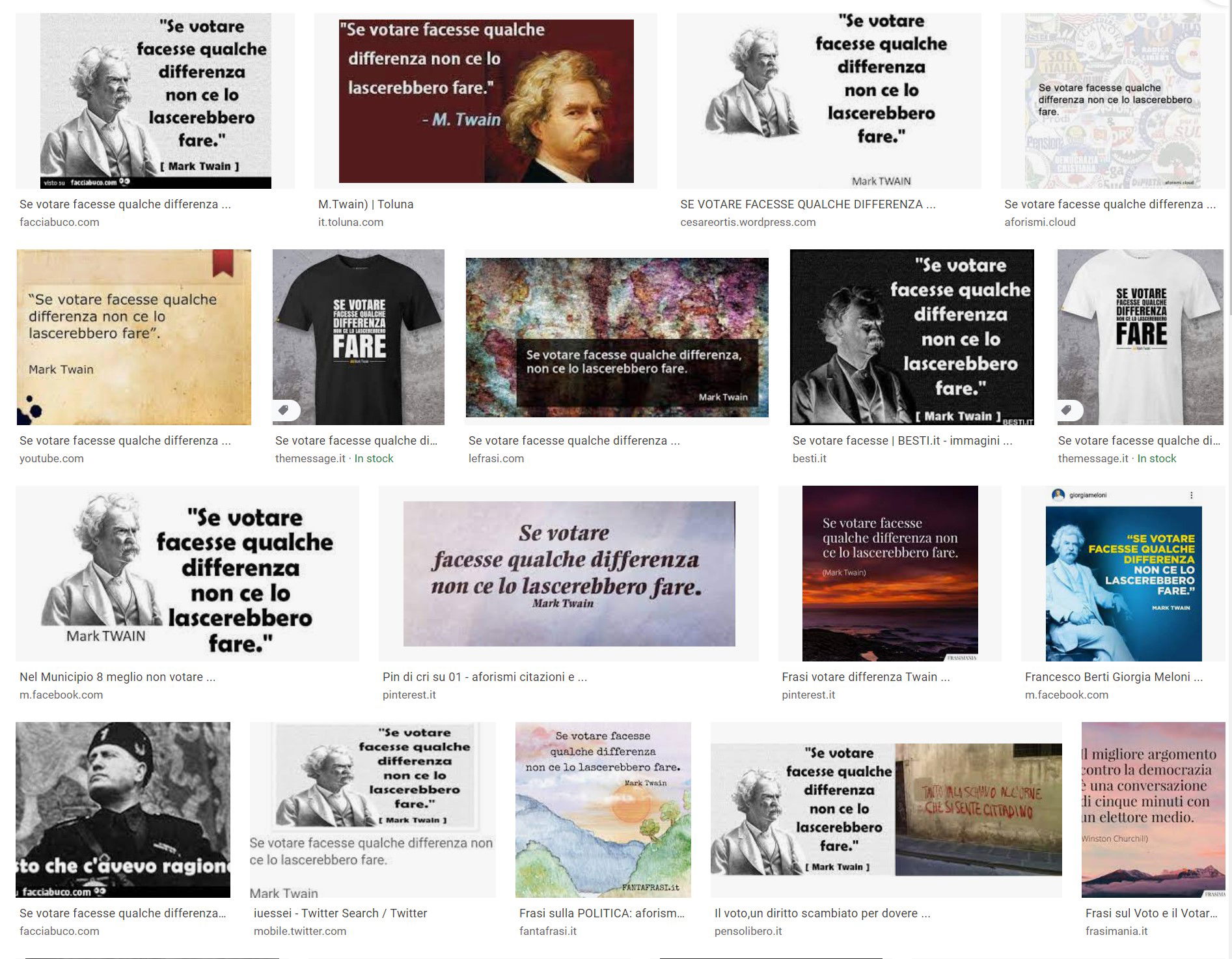 Giusto per onor di cronaca in inglese la frase – non attribuita a Twain – compare una prima volta in un articolo del 1976. Cercando invece sul web italiano, il primo ad averla diffusa in maniera virale sembra essere proprio Beppe Grillo, ma esistono svariati profili di utenti di forum che la usano come firma nei loro post, è possibile che siano questi ad averla diffusa. Quello che conta è che ora sapete che non è di Mark Twain, e che sarebbe bello che in poco tempo tutti quegli aforismi sbagliati che vengono condivisi venissero corretti o rimossi. Lo so, sono un inguaribile utopista…