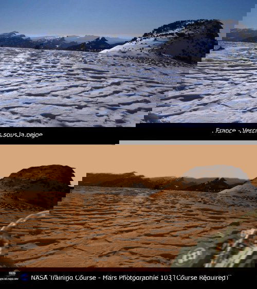 Ma dovrei trovare la stessa immagine su un sito o altro archivio della NASA, con una descrizione che accerti che sia stata usata come immagine di Marte. La bufala in questo caso non è “quello nell’immagine non è Marte, sono i monti della Francia”, bensì “la NASA in un suo corso sostiene che quello sia Marte, mentre invece sono i monti della Francia”. L’immagine che sta circolando, infatti, esiste solo nella versione a confronto con le montagne francesi innevate, non si trova traccia della stessa foto virata in rosso spacciata per un’immagine di Marte – se non sui siti di complottisti e negazionisti vari – figuriamoci in un corso della NASA. Purtroppo di soggetti che cascano in giochetti simili se ne trovano sempre, come si trovano coloro che ritengono che quelli per l’esplorazione spaziale siano soldi usati male, e proprio per questa ragione voglio riportarvi le considerazioni fatte da Chi ha paura del buio qualche giorno fa: