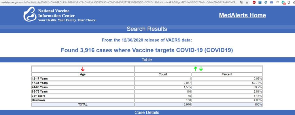 Su sei milioni di persone, in un arco di tempo di un mese, tredici decessi sono statistica. Ovvero è abbastanza normale che su una popolazione così ampia ci siano persone che muoiono, con o senza vaccino. Il fatto che l’evento succeda a distanza di un giorno o due dal vaccino non significa affatto che le due cose siano collegate fra loro. Non spiegarlo è disinformare. Anche negli States, come nel resto del mondo, si viene vaccinati per fasce di rischio, quindi riportare che il 54,85% dei casi che hanno necessitato qualche cura avesse un’età compresa tra 17 e 44 anni significa poco. Erano soggetti che andavano vaccinati, o perché già compromessi nella salute da altre patologie o perché operatori che lavorano a stretto contatto con gli altri, e che quindi hanno bisogno di essere protetti. Si tratta comunque di 481 soggetti su circa sei milioni di vaccinati. Meno dello 0,01%. In generale secondo i dati di MedAlerts ci sono state circa lo 0,06% di reazioni avverse. Un numero minuscolo.