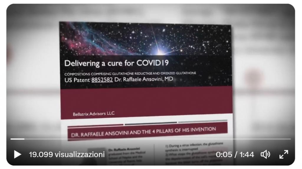 Che pur parlando di una cura per COVID-19 fa riferimento a un brevetto del 2010 registrato da Ansovini per un composto a base di glutatione, ma non esistono studi che dimostrino l’efficacia del suddetto composto su pazienti con COVID-19; e chiunque, se ha i denari per farlo, può registrare un brevetto, la sua esistenza non significa che quanto brevettato abbia una qualche utilità. L’altro screen che viene mostrato è questo:
