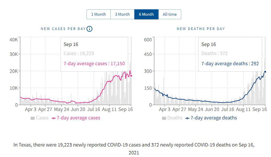 In Texas , ci sono stati 19.223 nuovi casi di COVID-19 segnalati e 372 nuovi decessi di COVID-19 segnalati il 16 settembre 2021