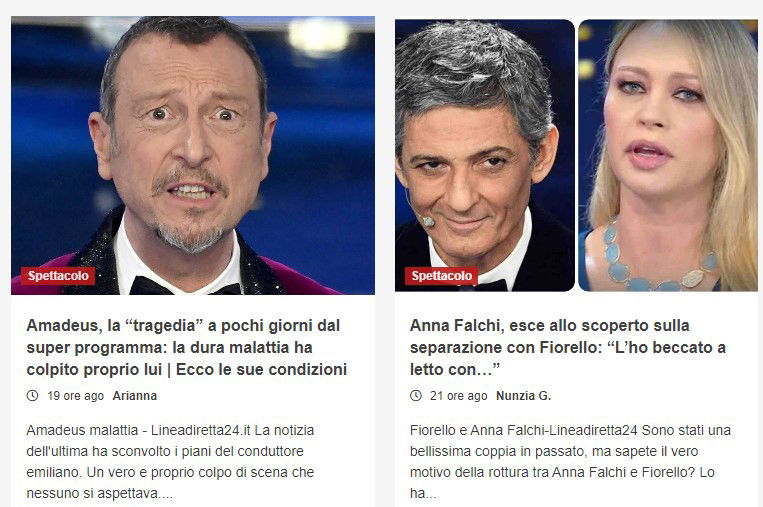 Classico clickbait che anticipa con frasi (che cercano di essere) accattivanti, alcune con tanto di puntini di sospensione, manca solo il nostro click per concludere la frase e scoprire l’interessantissimo mistero. Ma una volta aperti i link non ci raccontano nulla di sconvolgente, nulla di eclatante, e come sappiamo bene in rete le cose funzionano così da anni. Chi ci legge con costanza è consapevole di quanto ci piacerebbe vedere un web 3.0 ripulito da questo genere di link a “notizie”, ma non è una cosa semplice da fare senza intaccare la libertà d’espressione. Perché gli articoli qui sopra non diffondono bufale, ma solo sensazionalismo: difficile che i diretti interessati decidano di depositare una denuncia, e ancor più difficile che un magistrato punisca chi pubblica questo genere di contenuti.