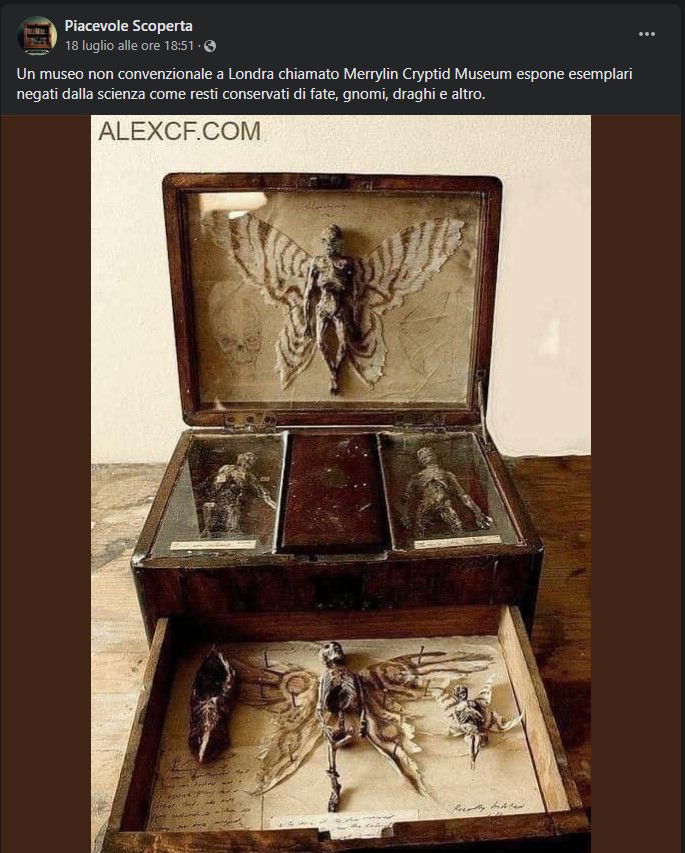 Potremmo definire il “museo” un’opera d’arte, creata appunto da Alex CF, non ci sono conservati “esemplari negati dalla scienza” come sostenuto dai due admin di Piacevole Scoperta, vi sono ritratte alcune delle opere di un artista che si è divertito, nulla di più. Ci tengo a precisare: musei pieni di opere di fantasia, se fatti bene, hanno comunque un valore artistico, l’articolo che avete appena letto non vuole concentrarsi sul museo di per sé, ma sui post di una delle migliaia di pagine che spuntano come funghi e che cercano di attirare pubblico con post sensazionalisti, se non completamente falsi.