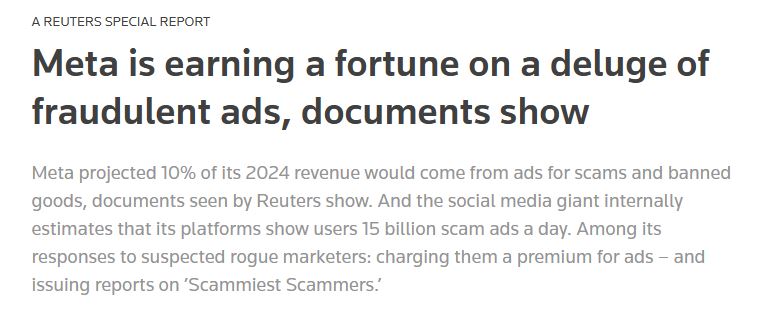Un'indagine di Reuters mostra che Meta guadagna consapevolmente enormi cifre dai contenuti sponsorizzati truffaldini
