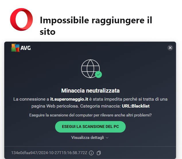 Se comunque decidiamo di mettere il tag ci viene inviato un messaggio privato con l’invito a cliccare su un link, link che ci rimanda a un sito – holidaystoday.info – che reindirizza a it.superomaggio.it, che a sua volta viene subito riconosciuto da alcuni antivirus come sito pieno di malware (che al mercato mio padre comprò).