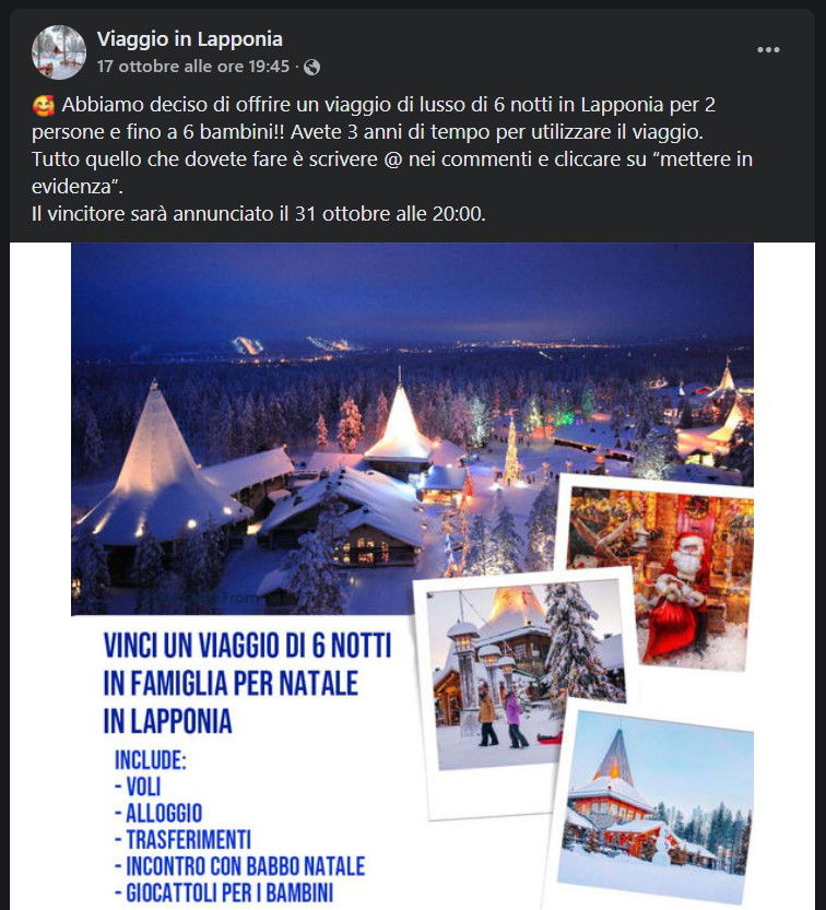 Pagina che ha aperto i battenti l’11 ottobre e che grazie a questo trucchetto ha quasi raggiunto i 10mila follower con il minimo sforzo, senza aver bisogno nemmeno di un’inserzione a pagamento, e sta raccogliendo i frutti di quello specchietto per le allodole che è il viaggio in Lapponia in regalo.