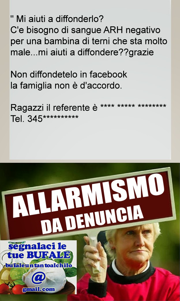 Ok? Avete capito bene tutti? Chiunque di voi che condividerà bufale di questo tipo (che intasando centralini di ospedali e associazioni tipo AVIS rischia d’intralciare il lavoro di chi le emergenze le tratta ogni giorno) peste lo colga! Giusto per chiarire, qui sopra l’annuncio viene da Terni, ma nell’ultima settimana (uguale identico) ha circolato con indicazioni geografiche varie ed eventuali, perché i signori, col pisellino piccolo, che l’hanno messo in circolo si sono divertiti a farlo girare con Modena, Ferrara, Terni, e altre ed eventuali…Ogni volta che vedete messaggi simili a questo segnalate a chi l’ha condiviso che NON STANNO FACENDO un servizio ma stanno causando un DISSERVIZIO.