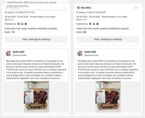 Ma basta visitare la libreria inserzioni del profilo (aperto da pochissimi giorni) per trovare due post sponsorizzati con lo stesso identico testo: