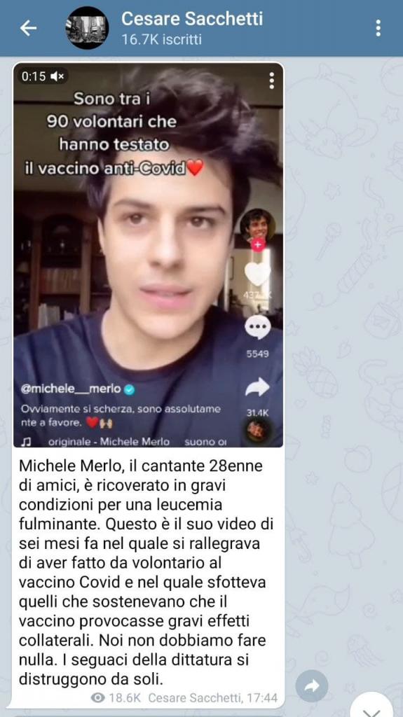 Sfruttare quanto è successo al giovane Merlo è orrendo: la leucemia fulminante non ha alcun collegamento con un eventuale vaccino (che Merlo non aveva comunque fatto a dicembre, vista la giovane età: nel video stavo solo prendendo in giro i soggetti come Sacchetti). Come hanno spiegato sul Resto del Carlino:
