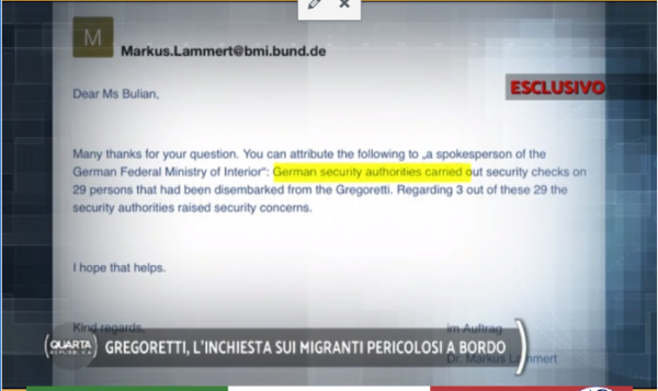 L’argomentazione in favore di Salvini, secondo il servizio della trasmissione di Nicola Porro, sarebbe da individuarsi in incartamenti pubblicati in Germania, che confermano che sulla nave vi erano soggetti pericolosi. L’incartamento a cui si fa riferimento lo trovate qui, è in tedesco ma riporta più o meno quanto spiegato nel servizio di Quarta Repubblica. Ovvero che dei funzionari tedeschi avevano intervistato 29 persone tra i migranti della Gregoretti, e che tra essi ce ne fossero alcuni che avevano motivo di ritenere pericolosi.