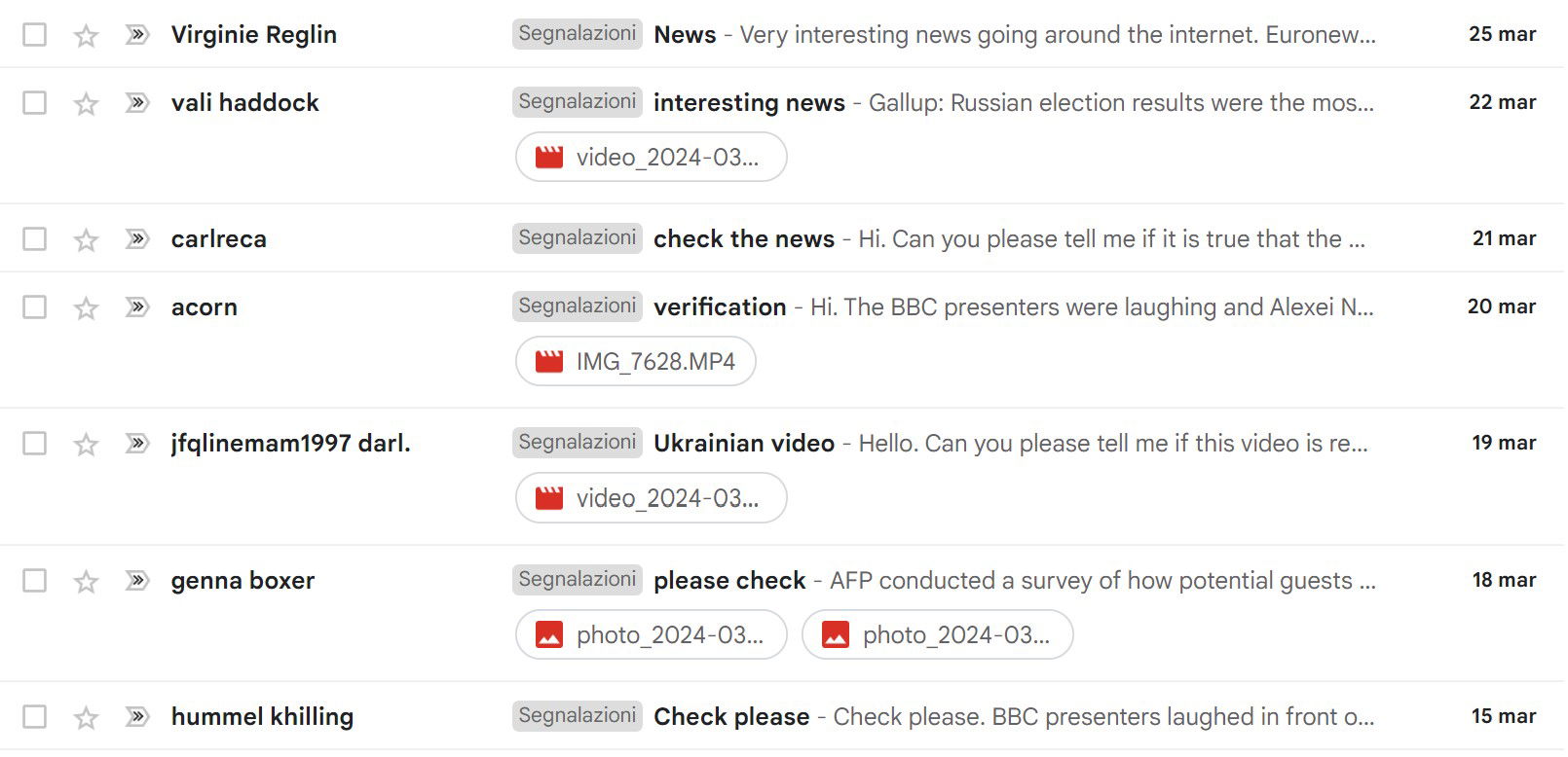 Abbiamo chiesto ad altri colleghi, sia in Italia che all’estero, se anche loro le ricevono, e la risposta è stata positiva: i fact-checker sparsi per l’Europa stanno ricevendo sistematicamente mail che invitano a visitare link Telegram e similari. Certi colleghi hanno scelto, come noi, di non guardarle più, altri le aprono usando browser su PC specifici fatti apposta per evitare rischi, altri ancora le trattano come comuni segnalazioni.