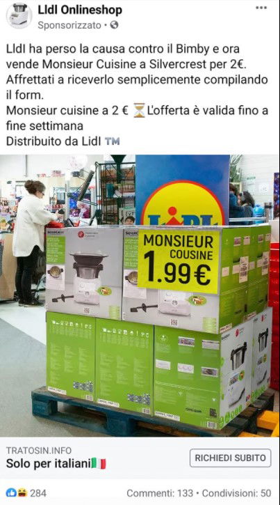 Già ad aprile 2021 un post sponsorizzato simile aveva fatto la sua comparsa sul web italiano, se ne erano occupati i colleghi di FACTA. È vero che in Spagna Lidl ha perso la causa che gli era stata fatta dalla Vorwerk, ma solo in Spagna. Quella sentenza che vede il Monsieur Cousine violare brevetti del Bimby non ha comunque alcun valore in Italia, dove il prodotto viene tutt’ora venduto da Lidl.