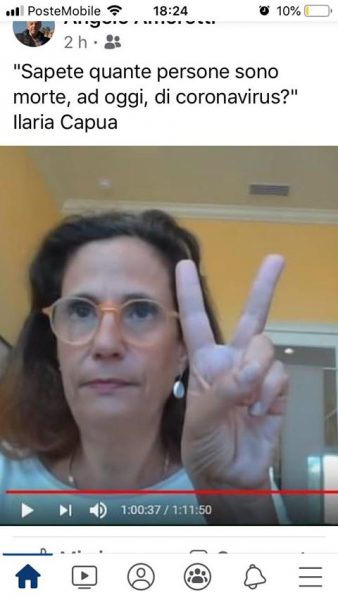 Nello screenshot si vede Ilaria Capua che mostra due dita della mano nel classico segno di vittoria. Il testo che accompagna lo screenshot riporta: