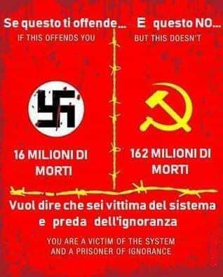 Se questo ti offende (la svastica) e questo no (falce e martello) Vuol dire che sei vittima del sistema e preda dell’ignoranza. Sotto i due simboli sono riportati dei numeri, con la svastica si parla di 16 milioni di morti con falce e martello 162 milioni di morti.