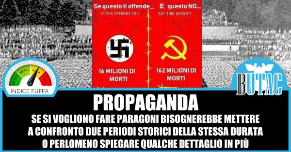 Vediamo di capirci, è vero che i nazisti hanno causato la morte di circa 16 milioni di persone? Diciamo di sì, nel senso che tra soldati morti per mano di azioni di guerra nazista e civili morti per repressione nazista il numero è suppergiù quello. Calcolato sui morti dall’apertura dei campi di concentramento fino alla fine della guerra. Se dovessimo fare un confronto corretto paragoneremmo i numeri con lo stesso periodo in Russia. Volendo allargare il campo potremmo decidere di tenere presente i due leader politici, e quindi paragonare gli anni con Hitler al comando con quelli in cui c’era Stalin.