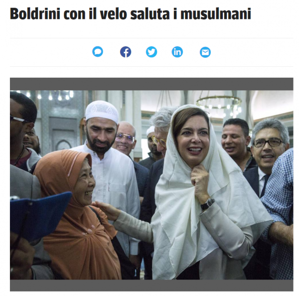 La foto originale di Laura Boldrini risale al 2014, quando l’allora Presidente della Camera è andata in visita alla Grande Moschea di Roma. Il gesto di Laura Boldrini di coprirsi il capo è per rispetto al luogo sacro per la religione islamica, esattamente come succede quando entriamo in alcune chiese e dobbiamo evitare pantaloni corti e spalle scoperte. Non c’è da indignarsi. Sfruttare quella foto per inserirla in contesto differente è a mio avviso disinformare i propri lettori. Che lo facciano i politici è grave, ancor più grave è che lo faccia un giornalista senza specificare nel testo dell’articolo che si tratta appunto di un fotomontaggio.