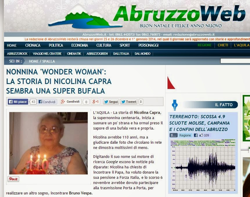 Sorry per la latitanza, ma come già detto le feste sono un periodo impegnativo per me, ora sto aiutando la befana a preparare i sacchi di carbone…che di cattivi il nostro paese è pieno…mica di bimbi, ma di adulti. A proposito di adulti cattivi, vi ricordate che ieri sulla storia di Nicolina Capra la nonna ultracentenaria vi avevo scritto che avevo contattato un redattore del Messaggero? E come ho fatto con lui ho fatto con altri…beh una piccola testata locale come AbruzzoWeb ha subito colto la palla al balzo e pubblicato una semi smentita sulla storia della nonna facebook: http://www.abruzzoweb.it/contenuti/nonnina-wonder-woman–la-storia-di-nicolina-capra–sembra-una-super-bufala/535803-365/
