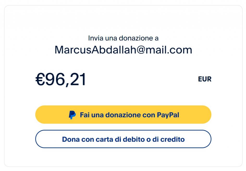 Console da videogiochi che oggi costa sui 268 euro su Amazon. Console che nel link che ci avete segnalato viene offerta a 96,21 euro. Ho simulato l’acquisto, come facciamo sempre per capire dove e come vengano inviati denari e, come ci era stato segnalato, sono finto di fronte a una donazione PayPal, unico sistema per fare l’acquisto. Sì avete capito bene, quello che si spaccia per un sito di vendita, quando si arriva ad avere un carrello pronto per il checkout, come unica opzione presenta Paypal, e non come acquisto, bensì come donazione a Marcus Abdallah: