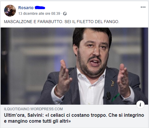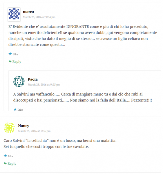 marco March 25, 2016 at 9:54 pm E’ Evidente che e’ assolutamente IGNORANTE come e piu di chi lo ha preceduto, nonche un emerito deficiente!! se qualcuno aveva dubbi, qui vengono completamente dissipati, visto che ha dato il meglio di se stesso… se avesse un figlio celiaco non direbbe stronzate come questa… Like Reply Paola March 29, 2016 at 9:25 pm A Salvini ma vaffanculo….. Cerca di mangiare meno tu e dai ciò che rubi ai disoccupati e hai pensionati…… Non siamo noi la falla dell’Italia…. Pezzente!!!! Like Nancy March 25, 2016 at 7:36 pm Caro Salvini “la celiachia” non è un lusso, ma bensì una malattia. Sei tu quello che costi troppo con le tue cavolate.