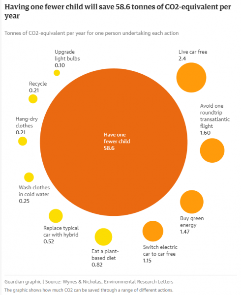 L’avete notata la sproporzione? Un figlio in meno vale come risparmio di CO2 più della somma di tutte le altre cose che possiamo, come singoli utenti, fare per contrastare la produzione di CO2. Io non sono uno scienziato, solo un fact checker, il mio compito è darvi fonti dei dati, non giudizi morali o etici sulla questione.