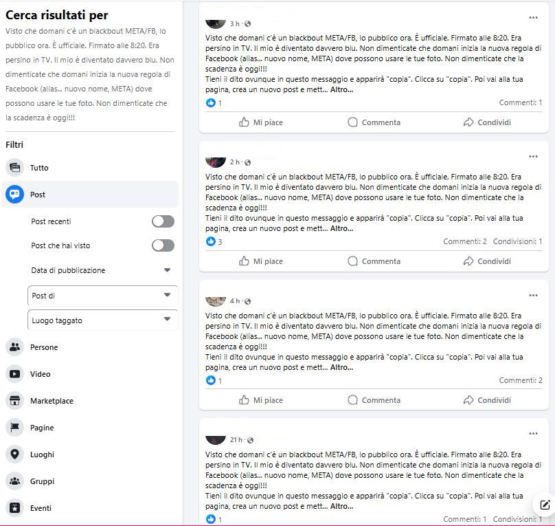 Pubblicare questi annunci sulla nostra bacheca serve solo a una cosa: a indicare che non sappiamo bene come funziona lo strumento che stiamo utilizzando, che siamo suggestionabili, e che possiamo quindi essere utili alla diffusione di disinformazione e truffe. Se il post è impostato con privacy pubblica, inoltre, con una semplice ricerca testuale si può ottenere un pratico elenco di account che lo hanno pubblicato, a cui inviare tentativi di truffa di vario genere.