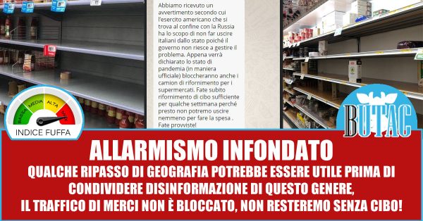 Abbiamo ricevuto un avvertimento secondo cui l’esercito americano che si trova al confine con la Russia ha lo scopo di non far uscire italiani dallo stato poiché il governo non riesce a gestire il problema. Appena verrà dichiarato lo stato di pandemia (in maniera ufficiale) bloccheranno anche i camion di rifornimento per i supermercati. Fate subito rifornimento di cibo sufficiente per qualche settimana perché presto non potremo uscire nemmeno per fare la spesa .
