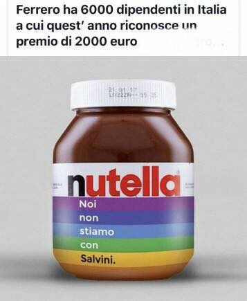 Il meme che circola però me l’avete segnalato in tantissimi, perché oltre alla notizia riporta un vasetto di Nutella un po’ particolare: sul fianco, infatti, appare la bandiera arcobaleno e la scritta Noi Non Stiamo Con Salvini.