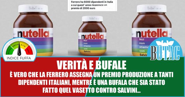 Il mix di testo, notizia e immagine del vasetto ha fatto venire il dubbio a tanti che sia tutta una bufala. Secondo il Sole 24 Ore e tante altre testate (già a settembre 2019, come in altre occasioni) la Ferrero ha deciso di dare un premio produzione di 2000 euro a testa ai seimila dipendenti dell’azienda. Non è la prima volta che succede, probabilmente non sarà l’ultima. La Ferrero è un’azienda italiana, in buone condizioni di salute, anzi direi ottime. Corretto che paghi premi produzione. Sono sicuro ci siano altre aziende che fanno lo stesso ma essendo meno note non finiscono sui giornali. Quindi la notizia del premio produzione è vera, ma di qualche mese fa.