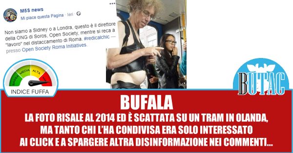 Io sono qui per fare fact checking, e posso dirvi che questa foto risale a 4 anni fa, si tratta di un signore fotografato su un tram olandese, nulla a che vedere con Open Society o Soros. Ma credete che sia importante per chi l’ha condivisa? La foto serviva solo ad attirare like e interazioni, e poter sfruttare la viralità della stessa per diffondere altra disinformazione. Perché è così che la misinformation riempie la rete, per merito di blog come M5Snews, per merito di pagine social da 100mila like come questa.