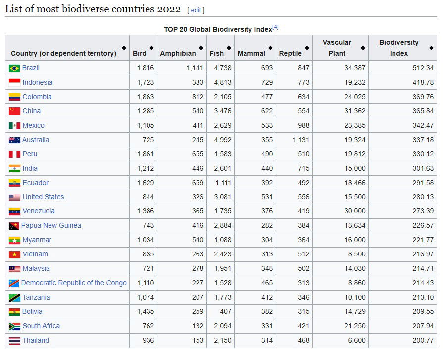 In realtà anche il CREA, pur dando il dato corretto sulla superficie delle terre emerse, racconta una panzana quando fa riferimento alla biodiversità, e dire che bastava fare due ricerche in rete… Infatti i Paesi con la maggiore biodiversità sono in ordine: