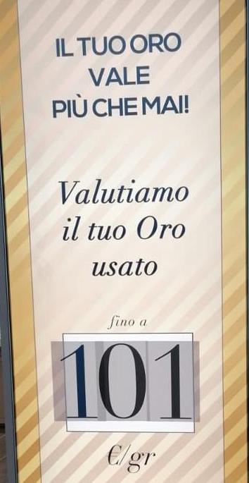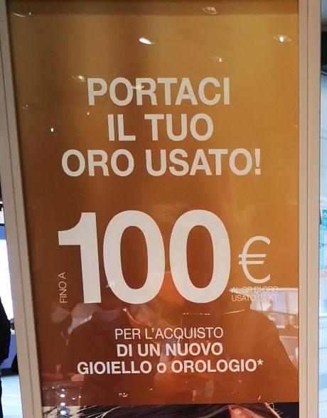 Veniamo quindi alle due pubblicità di cui sopra. Nessuna delle aziende autrici di quella cartellonistica ha perso la testa, sanno benissimo quanto vale l’oro, e state tranquilli, non vi regalano nulla. La frase “fino a 100 euro” non ha alcun significato. E purtroppo anche andando sui loro siti le spiegazioni sono scarsissime. Dicono di chiamare un numero verde o di presentarsi in negozio. Io invece vorrei che fosse chiaro che nessuno paga l’oro più del suo valore di quotazione, ripeto: nessuno. Di solito a quei cartelli corrispondono offerte del tipo che se compri un qualcosa che sta in un determinato valore, il tuo oro usato ti dà diritto a uno sconto fino a una certa cifra. Ma vedete, basta aver tenuto conto della faccenda in fase di creazione del prezzo per non regalarvi nulla, e farci bella figura.