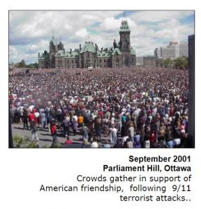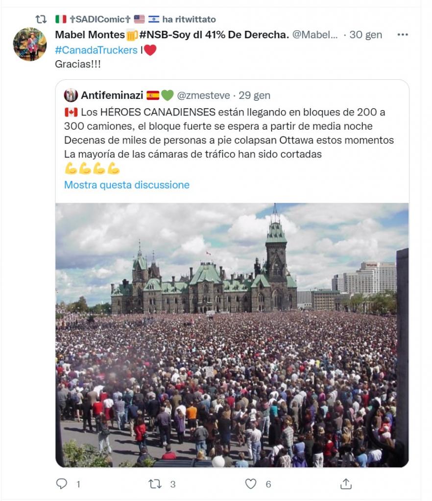 C’è solo un problema, Ottawa è sotto la neve e ci sono -9°. Quella gente è per la maggior parte in abbigliamento primaverile, felpa e pantaloni leggeri. Di neve in quell’immagine non c’è traccia. Sia chiaro, questo non significa che non ci siano proteste a Parliament Hill, ce ne sono, come dimostra la gallery in quest’articolo. Ma la folla è meno oceanica (sia chiaro, a vedere negli articoli sono comunque tanti) di quanto l’immagine qui sopra voglia fra credere. Siccome la foto non salta fuori con TinEye o con Google Lens se non collegata alle attuali proteste, è evidente che chi l’ha condivisa per primo è in possesso dell’originale che ha ricavato probabilmente da un video che inquadra chissà quale evento nella stessa piazza la folla che si era riunita a settembre 2001 in segno di fratellanza con la popolazione americana dopo gli attentati dell’11 settembre, come dimostra questo screenshot recuperato dal nostro Thomas The Biker ad articolo già pubblicato: