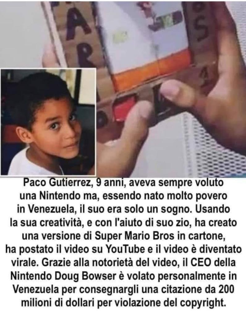 Paco Guitierrez 9 anni, aveva sempre voluto una Nintendo ma, essendo nato molto povero in Venezuela, il suo era solo un sogno. Usando la sua creatività, e con l’aiuto di suo zio, ha creato una versione di Super Mario Bros in cartone, ha postato il video su YouTube e il video è diventato virale. Grazie alla notorietà del video, il CEO della Nintendo Doug Bowser è volato personalmente in Venezuela per consegnarli una citazione da 200 milioni di dollari per violazione del copyright.