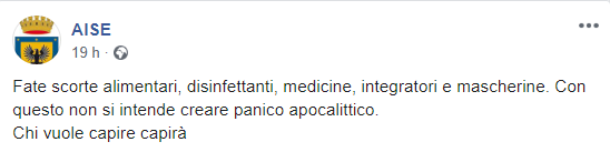 La pagina di cui parlo si chiama AISE, e diffonde “informazione” su Facebook dal 2014. Il post che ha attirato la mia attenzione è questo: