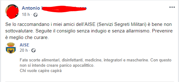 Da una delle condivisioni: “Se lo raccomandano i miei amici dell’AISE (Servizi Segreti Militari) è bene non sottovalutare. Seguite il consiglio senza indugio e senza allarmismo. Prevenire è meglio che curare.”