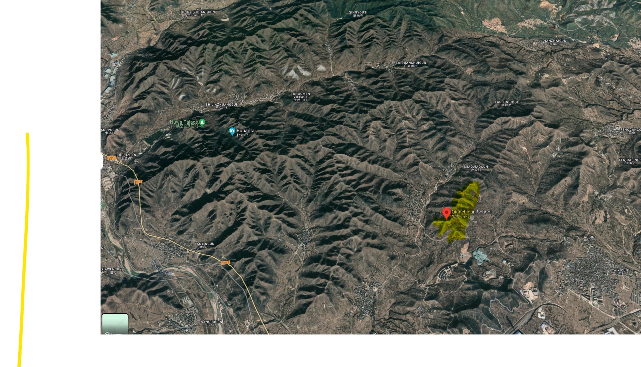Chi l’ha scritto nemmeno ha provato a approfondire la notizia. Noi nel corso del tempo abbiamo cercato di condividere con voi gli strumenti che possono permetterci di fare meglio di così, come sapete il primo consiglio che diamo è sempre quello di verificare i fatti prima di condividere, e nel caso che ce ne sia bisogno approfondirli prima di contribuire alla loro diffusione sui social, sui servizi di messaggistica istantanea o in altri luoghi della rete. Il video è vero, e sicuramente fa una certa impressione. Ma non ci si può limitare al video senza studiare la questione. Siamo in Cina in una zona montuosa decisamente vasta – le coordinate su Google Maps per chiunque volesse dare un’occhiata all’area sono queste: 36.6233839, 113.6820559. Qui sotto uno screenshot della zona: