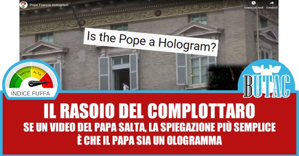 C’è questa storiella che sta diventando virale, più negli Stati Uniti al momento in cui scrivo, ma arriverà anche da noi, ne sono sicuro. Sostengono che il Papa sia un ologramma, perché un canale americano, in un servizio sul Papa, lo mostra svanire nel nulla, come se fosse un ologramma che è stato spento. Qui potete vedere uno dei tanti video complottari che stanno circolando: