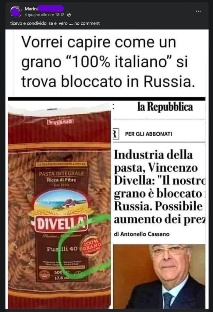 …il meme nasce da un equivoco facilmente verificabile. Divella – così come altre aziende che producono pasta e panificati – presenta diverse linee di prodotti: alcune di queste, effettivamente, vengono prodotte con grano 100% italiano, come capita per la pasta integrale. Altre linee, invece, utilizzano grani importati. E questa è la spiegazione che è stata fornita da Domenico Divella, responsabile del biscottificio del noto marchio di pasta e panificati che opera nel sud Italia: «La pasta nel post di Facebook (messa a confronto con l’articolo di Repubblica in cui si parla di importazione di grano russo, ndr) appartiene alla linea integrale che è a tutti gli effetti prodotta nella nostra azienda con semola di grano duro 100% italiano».