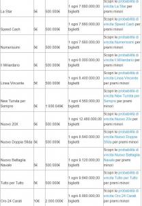 Una parte della Tabella delle probabilità di vincita per ciascun tipo di Gratta e Vinci attualmente immesso sul mercato presente sul sito ufficiale di Gratta e Vinci