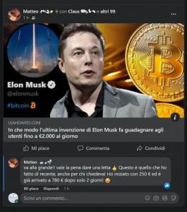 Che non è stato condiviso dal mio amico Matteo, ma pubblicato in automatico grazie a un click su un link malevolo, esattamente come il commento in cui sempre Matteo pare volerci convincere ulteriormente della bontà di un investimento in trading online. Fuffa al quadrato!