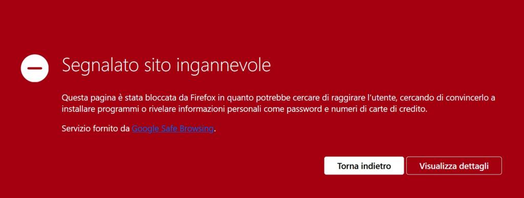 Quindi giusto per farvi vedere cosa succede ho testato il link per voi, così da diffondere il più possibile il messaggio che si tratta di una truffa! Cliccando sul link tramite un browser serio (non da cellulare, MAI da cellulare) la prima cosa che ci viene subito comunicata è che si tratta appunto di un sito ingannevole: