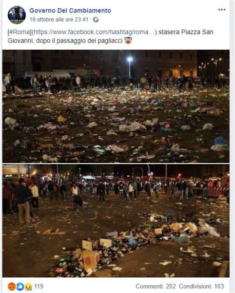 In rete stanno circolando due foto che mostrerebbero Piazza San Giovanni a Roma dopo la manifestazione della Lega di sabato 19 ottobre. Ma le foto che vengono fatte circolare riguardano il concertone del Primo maggio del 2014.
