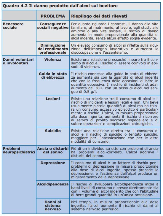 Pagina 1 (di due e mezzo) sui danni prodotti dall’alcol sul bevitore (se contiamo anche i danni prodotti a terzi si arriva a 3 pagine e mezza) del documento “L’alcol e l’assistenza sanitaria primaria. Linee guida cliniche per l’identificazione e l’intervento breve” dell’Osservatorio Naizonale Alcol CNESPS dell’Istituto Superiore di Sanità che potete trovare a questo link