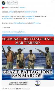 Manfredi Potenti in quanto Senatore della Repubblica prende uno stipendio pagato dalle tasse di tutti i cittadini del paese che rappresenta, vogliamo sperare che vista la brutta figura provveda a rimuovere i post, spiegando l’errore, come andrebbe fatto ogni volta che si sbaglia.