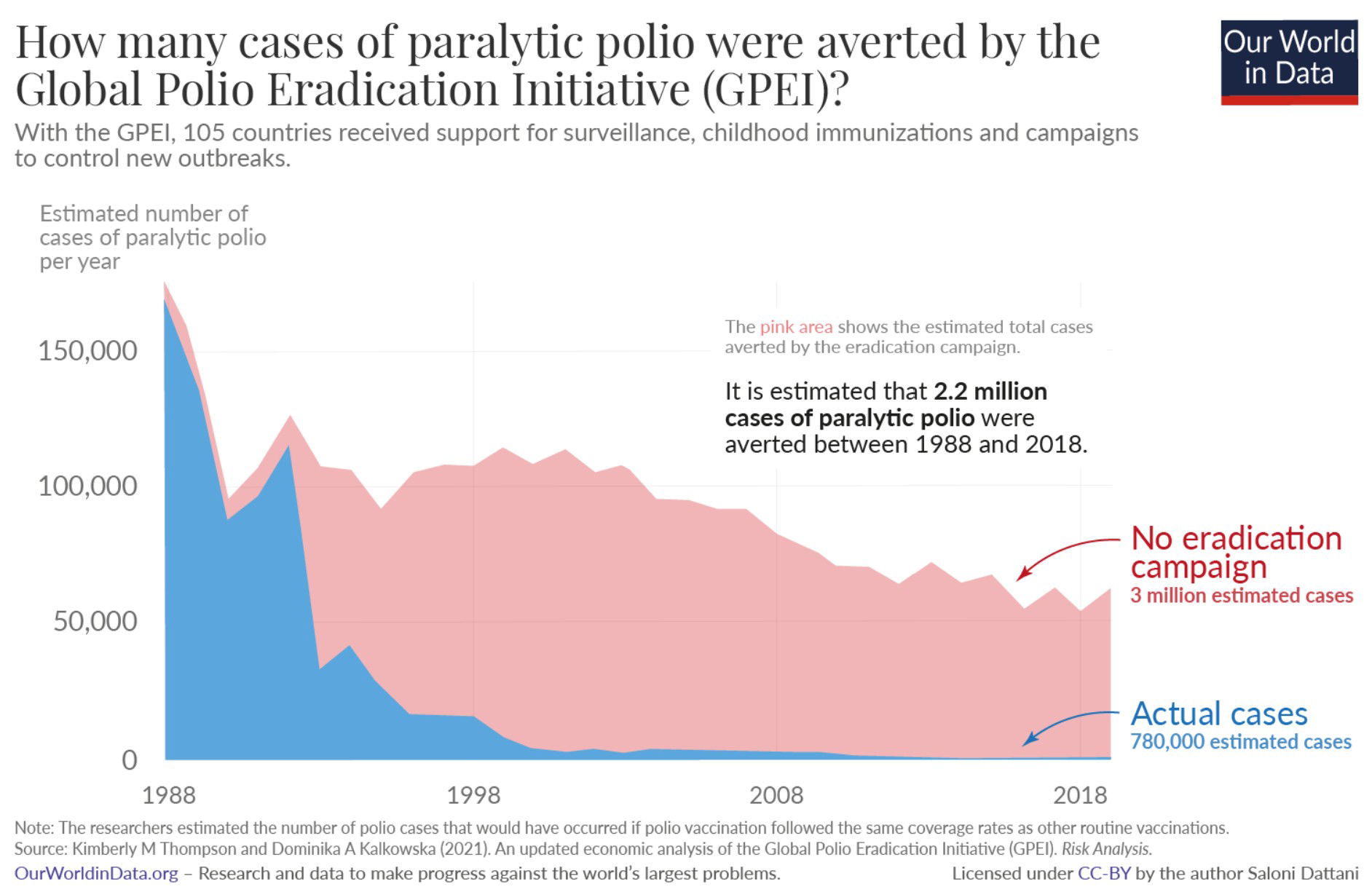 Si stima che, grazie ai vaccini, tra il 1998 e il 2018 si siano evitati circa 2.2 milioni di casi di poliomielite paralitica nel mondo.