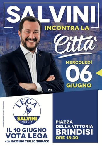 Il poster che si vede sulla destra riporta un mezzo busto di Salvini con scritto GRAZIE, è possibile trovarlo sul sito della Lega Nord di Arcore, pubblicato il 9 aprile 2018.
