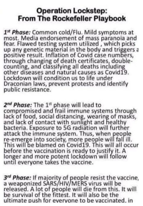 Come la maggior parte delle teorie del complotto, “Operazione Lockstep” si basa su un piccolo granello di verità: nel 2010, la Fondazione Rockefeller ha finanziato un esercizio di pianificazione di scenari che prevedeva come ipotetici eventi futuri potrebbero avere un impatto sullo sviluppo della tecnologia. Questo documento, tuttavia, non fornisce alcun tipo di “manuale operativo” su come produrre una pandemia globale . Piuttosto, prevede come il mondo sarebbe influenzato in quattro diversi scenari (compresa una pandemia globale).