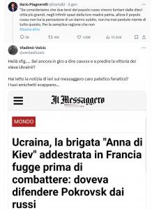 Ma passiamo oltre. L’articolo del Faro Di Roma porta la firma di Vladimir Volcic, giornalista indipendente che dimostra la sua partigianeria su X con commenti come questo dove, rispondendo a un giornalista di RaiNews24, scrive: