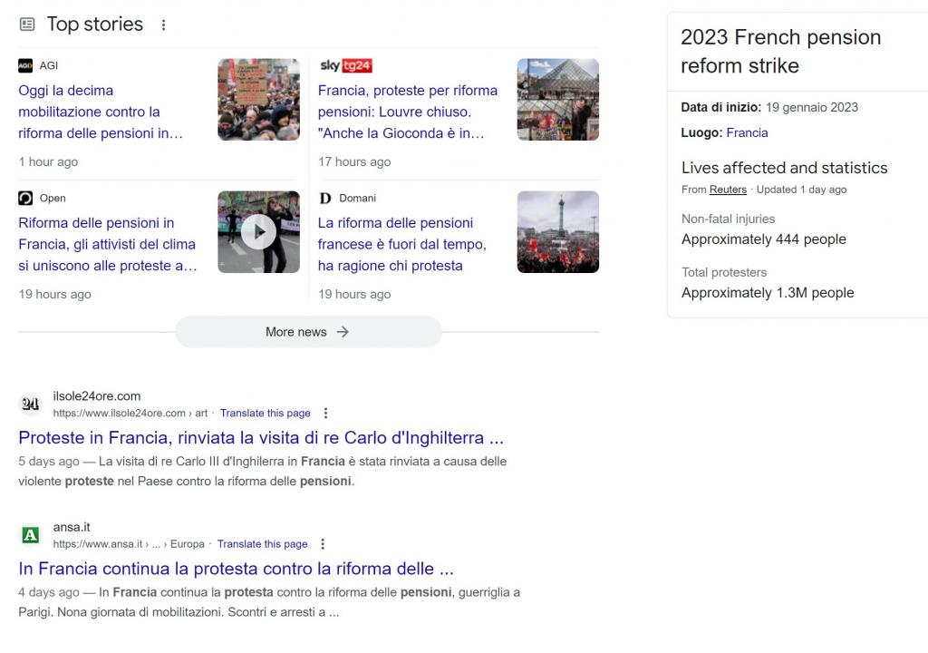 Nelle stesse ore in cui Pubble pubblicava il video bastava fare una velocissima ricerca in rete per verificare quanto il tema delle proteste per le pensioni in Francia venisse trattato da tutte le testate nazionali, alcune corredate da video. Sostenere che nessuno ne parlasse serve a fomentare la rabbia di chi segue soggetti come lei. Ma è una bugia.